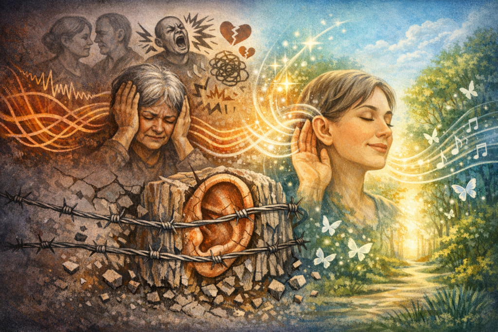28. oraz naszego a przez nas cudzego z wszelkich przyczyn, wszelkimi sposobami m.in. bycia tymi, którzy poprzez linie rodowe, wielopokoleniowe doświadczenia oraz osobiste historie życia utrwalali wzorzec nadmiernej adaptacji emocjonalnej, w którym bezpieczeństwo relacyjne było ważniejsze niż autentyczny odbiór i reakcja, kiedy ważny był wzorzec słuchania innych kosztem słuchania siebie, oraz tłumienie bodźców, słów i tonów, które były zbyt bolesne, zagrażające lub destabilizujące dla systemu nerwowego; odpowiednio funkcjonowania w środowiskach, w których to, co było słyszane, rani, a to, co jest prawdziwe, nie może zostać wypowiedziane ani bezpiecznie przyjęte; gdzie lepiej jest „nie słyszeć”, niż słyszeć konflikt, wrzaski, niespójność, niespełnione potrzeby lub emocjonalne przeciążenie; odpowiednio rozwijania strategii biologicznej ochrony, polegającej na stopniowym wycofywaniu percepcji, zagęszczaniu tkanek miękkich, ograniczaniu przewodnictwa i elastyczności — tak, aby bodźce świata zewnętrznego docierały słabiej, wolniej, mniej intensywnie; odpowiednio zapisywania w ciele przekonania, że pełne słyszenie oznacza odpowiedzialność, konieczność reagowania lub zagrożenie więzi, a więc że bezpieczniej jest nie odbierać wszystkiego, nie słyszeć do końca, nie być w pełni obecnym w polu dźwięku i relacji; odpowiednio powielania rodowego wzorca, w którym starzenie się łącz się z wycofaniem z dialogu, z życia w hałasie świata, z konfliktów i napięć — jakby ciało wybierało ciszę tam, gdzie psychika nie może już dźwigać dalszego dostosowania; odpowiednio doświadczania niedosłuchu nie jako defektu, lecz jako zapisu długotrwałej potrzeby ochrony, regulacji granic oraz zmniejszenia obciążenia emocjonalnego; oraz rozpoznania, że tkanki miękkie uczą się na nowo elastyczności dopiero wtedy, gdy system czuje się bezpieczny w prawdzie, w relacji i autonomii; odpowiednio zapisywania w ciele przekonania, że pełne słyszenie oznacza konieczność reagowania, odpowiedzialność lub zagrożenie granic, a więc że cisza jest bezpieczniejsza niż kontakt, oraz rozpoznania, że tkanki miękkie odzyskują elastyczność i przewodnictwo dopiero wtedy, gdy system czuje się bezpieczny w prawdzie, relacji i autonomii; oraz oddawania Bogu lęku przed słyszeniem w pełni — przed cudzymi emocjami, oczekiwaniami, oceną i nadmiarem bodźców — w intencji przywrócenia zdrowego odbioru, selektywności i wewnętrznej suwerenności, aby słuch mógł stać się ponownie narzędziem kontaktu, a nie obrony, aby ciało nie musiało już ograniczać percepcji, by chronić serce i układ nerwowy, aby tkanki miękkie odzyskały swoją naturalną zdolność do przewodzenia, amortyzowania i rozróżniania na przestrzeni wszystkich wymiarów, pokoleń, czasów i nie tylko, a to wszystko w zależności i odpowiednio w niezależności od m.in. woli, wytycznych, opinii, działań, poleceń, postanowień, podpowiedzi, inspiracji, łask, szczodrości i odpowiednio ich braku ze strony m.in. naszej duszy, całej naszej istoty i nie tylko oraz od bycia zdrowymi, lub chorymi fizycznie, energetycznie, rozchwianymi lub chorymi psychicznie-umysłowo, chorymi uleczalnie, lub przewlekle, lub nieuleczalnie oraz od bycia osobami kalekimi, osobami z urazami, osobami niedomagającymi, chorymi bezpośrednio lub posiadającymi objawy lub skutki karmiczne, wsobne m.in. rozmaitych chorób, dolegliwości, ułomność i nie tylko oraz naszego a przez nas cudzego doświadczania tego wszelkich skutków